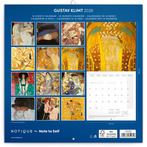 Obrazy populárneho secesného maliara Gustava Klimta na stránkach poznámkového kalendára. Ten obsahuje prehľadné kalendárium od septembra 2025 do decembra 2026 v šiestich jazykoch, mesačné fázy, dôležité sviatky a priestor pre poznámky na každý deň.