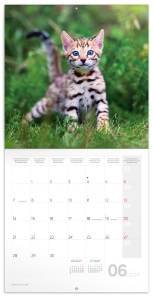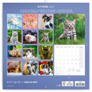Poznámkový kalendár s hravými a roztomilými mačiatkami, s ktorými by ste sa najradšej pomaznali. Vnútri nájdete prehľadné kalendárium od septembra 2026 do decembra 2027 v šiestich jazykoch, mesačné fázy, dôležité sviatky a priestor pre poznámky na každý deň.