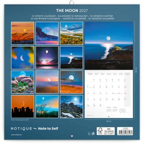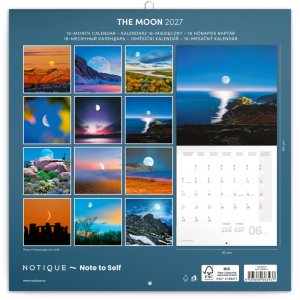 Magické snímky Mesiaca v poznámkovom kalendári s údajmi o mesačnej fáze na každý deň. Obsahuje kalendárium od septembra 2026 do decembra 2027, dôležité sviatky a priestor pre vaše poznámky a plány.