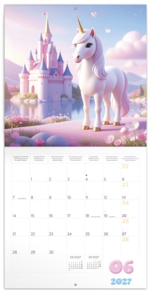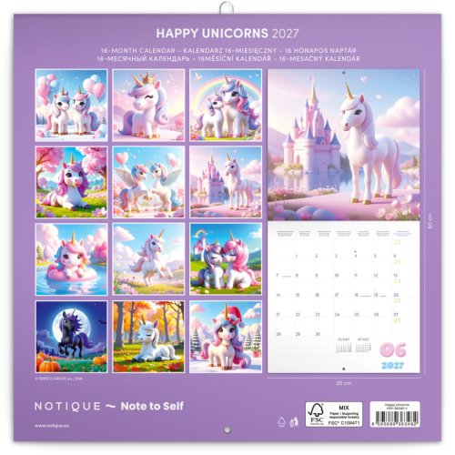 Poznámkový kalendár v pastelových farbách s motívom veselých jednorožcov, ktorí si užívajú život naplno. Vnútri nájdete prehľadné kalendárium od septembra 2026 do decembra 2027 v šiestich jazykoch, mesačné fázy, dôležité sviatky a priestor pre poznámky na každý deň.