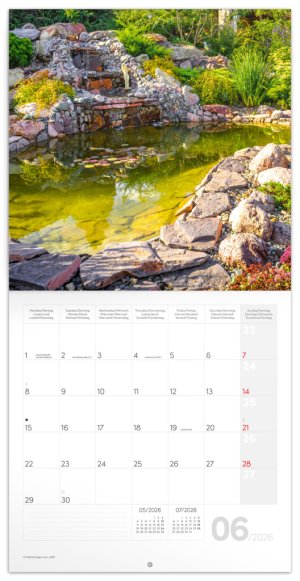 Rozjasnite svoj interiér farebnými fotografiami šľachtených záhrad. V kalendári okrem fotiek nájdete prehľadné kalendárium od septembra 2025 do decembra 2026 v šiestich jazykoch, mesačné fázy, dôležité sviatky a priestor pre poznámky na každý deň.