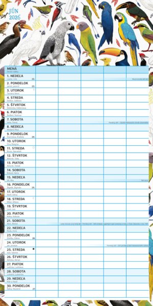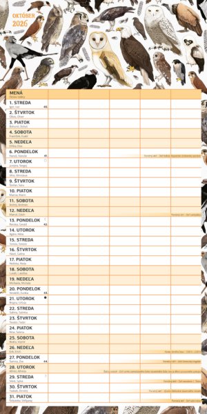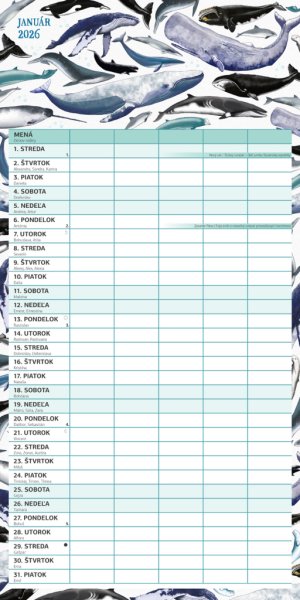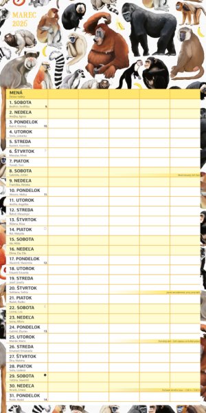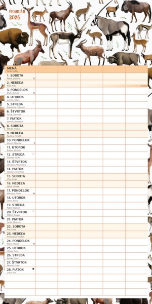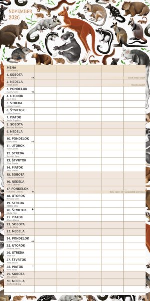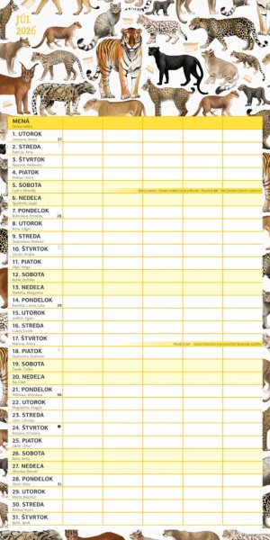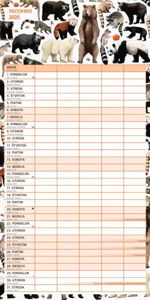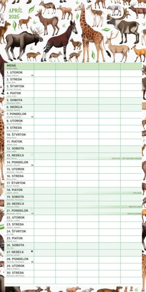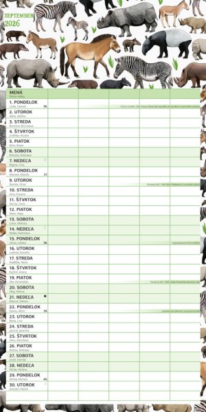 Slovenské kalendárium a samostatný plánovač aktivít pre až päť členov domácnosti dopĺňajú krásne ilustrácie zvierat. Nechýbajú štátne sviatky ani mesačné fázy.