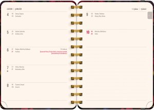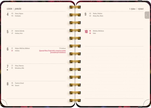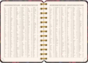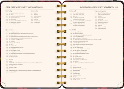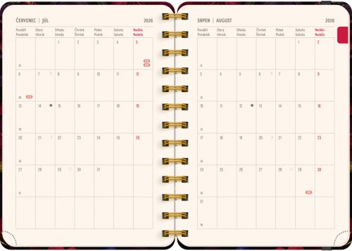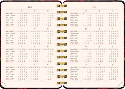 Osemnásťmesačný diár obsahuje prehľad na rok 2026 a 2027, zoznam českých a slovenských mien, česko-slovenské týždenné riadkové kalendárium s menami a sviatkami a priestor na poznámky v každom týždni. Kalendárium začína v júli 2026 a končí v decembri 2027.