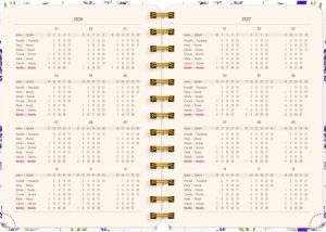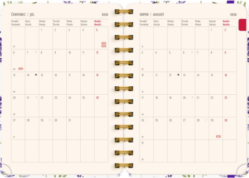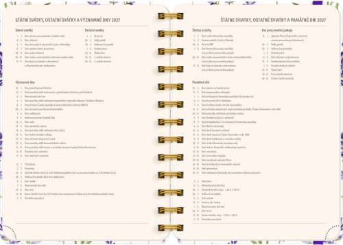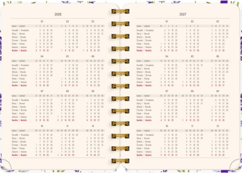 Osemnásťmesačný diár obsahuje prehľad na rok 2026 a 2027, zoznam českých a slovenských mien, česko-slovenské týždenné riadkové kalendárium s menami a sviatkami a priestor na poznámky v každom týždni. Kalendárium začína v júli 2026 a končí v decembri 2027.