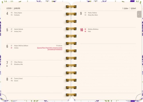 Osemnásťmesačný diár obsahuje prehľad na rok 2026 a 2027, zoznam českých a slovenských mien, česko-slovenské týždenné riadkové kalendárium s menami a sviatkami a priestor na poznámky v každom týždni.