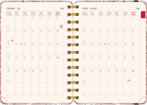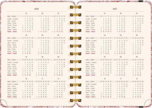 Osemnásťmesačný diár obsahuje prehľad na rok 2026 a 2027, zoznam českých a slovenských mien, česko-slovenské týždenné riadkové kalendárium s menami a sviatkami a priestor na poznámky v každom týždni. Kalendárium začína v júli 2026 a končí v decembri 2027.