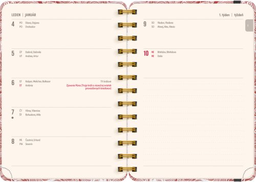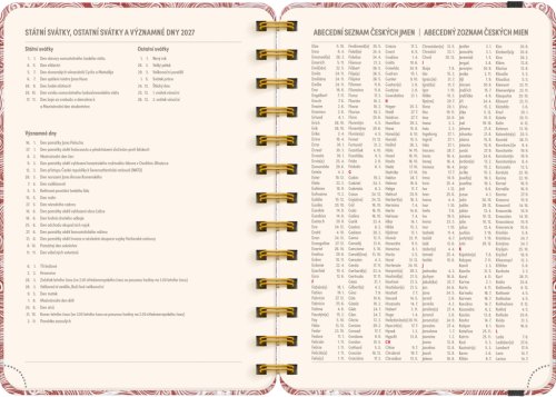 Osemnásťmesačný diár obsahuje prehľad na rok 2026 a 2027, zoznam českých a slovenských mien, česko-slovenské týždenné riadkové kalendárium s menami a sviatkami a priestor na poznámky v každom týždni.