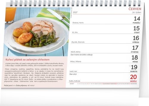 Pre všetkých, ktorí hľadajú inšpiráciu pri vymýšľaní nových jedál, je tu stolový kalendár nabitý tými najlepšími receptami. Nájdete tu 53 receptov, ktorých základom je poctivá domáca kuchyňa. Týždenný stolový kalendár so slovenskými menami obsahuje aj sviatky, pamätné dni, mesačné fázy a prehľad na celý rok.