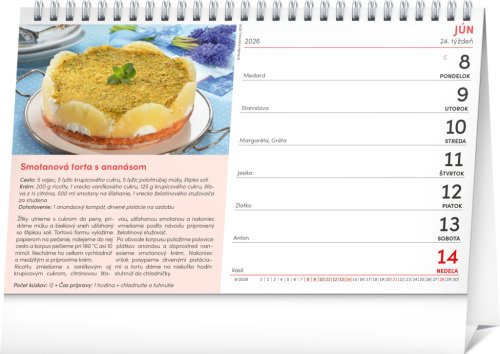 Oslaďte si život sladkými receptami z nášho kalendára. V ponuke sú zákusky, múčniky aj sladké bodky. Každý recept je doplnený fotografiou výsledného pokrmu. Stolný kalendár obsahuje okrem fotografií a textov aj slovenské kalendárium s menami, sviatkami a pamätnými dňami.
