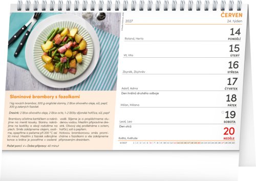 Stolový kalendár Recepty za kačku ponúka 53 tipov na rýchle a lacné pokrmy! Sami sa budete môcť presvedčiť, že variť sa dá chutne a zároveň lacno. Týždenné kalendárium s priestorom na poznámky obsahuje aj sviatky, pamätné dni, mesačné fázy a prehľad na celý rok.