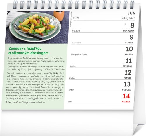 V kalendári nájdete 53 starostlivo vybraných receptov z tradičnej slovenskej kuchyne. Kalendár obsahuje týždenné slovenské kalendárium s menami, sviatkami a pamätnými dňami.