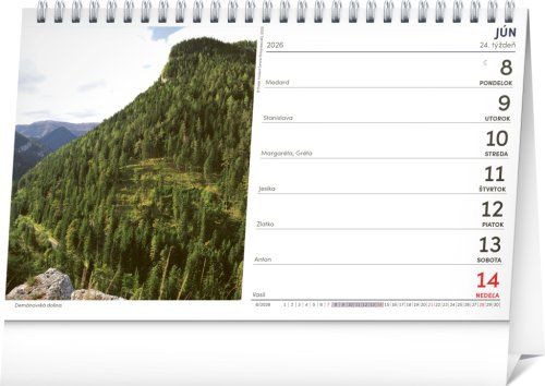 Pôsobivé snímky slovenskej krajiny a pamätihodností v stolnom kalendári s priestorom na poznámky. Štyro ročných období zachytených na 53 fotkách. Načerpajte inšpiráciu a vydajte sa na výlet do týchto malebných miest. Fotografie dopĺňa slovenské týždenné kalendárium s menami, sviatkami a pamätnými dňami.
