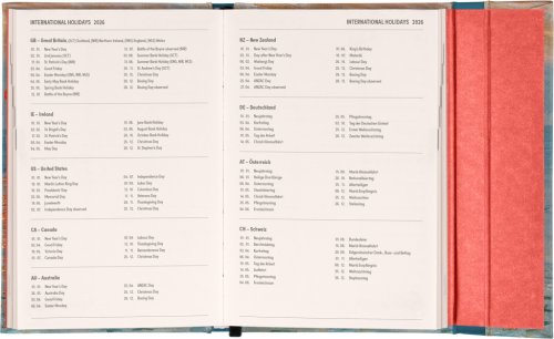 Týždenný diár v anglickom jazyku s medzinárodnými sviatkami a praktickým magnetickým uzatváraním je ideálnou voľbou pre tých, ktorí chcú mať svoje plány prehľadne pod kontrolou. Ponúka horizontálne rozloženie vo verzii týždeň na dvoch stranách s priestorom na poznámky. Súčasťou sú praktické mesačné prehľady, ideálne na plánovanie dovoleniek či prázdnin.