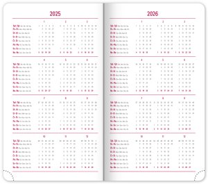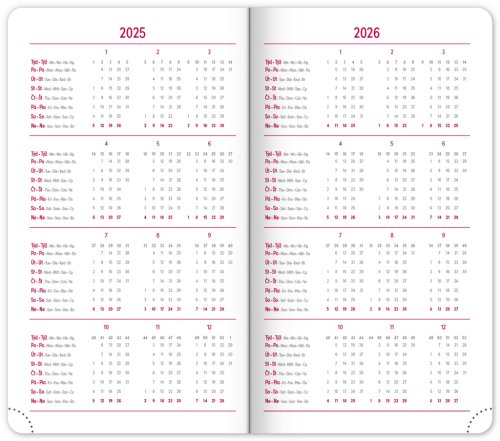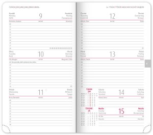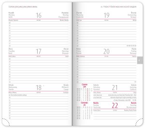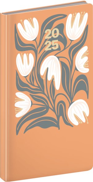 Vreckový diár Cambio 2025 so vzorom oranžových kvetov. Týždenný rozvrh s česko-slovenským kalendáriom a doplnkovou angličtinou, nemčinou, maďarčinou a ruštinou.