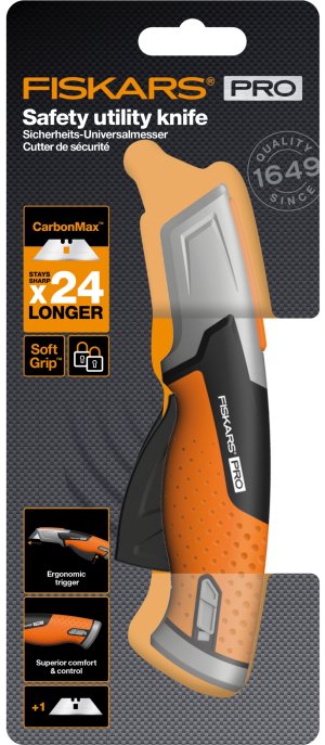 Nôž je vybavený automaticky zaťahovacou čepeľou pre maximálnu bezpečnosť. Má ergonomickú, textúrovanú rukoväť pre nekĺzavé zabezpečenie a pohodlie v ruke. Zosilnený kovový koniec poskytuje spoľahlivú odolnosť proti nárazom a pádom. Nôž má celokovovú konštrukciu na trvalú odolnosť. Má jednu čepeľ z uhlíka CarbonMax s povrchovou úpravou na zachovanie ostrosti, ktorá vydrží 24x dlhšie ako štandardné čepele.