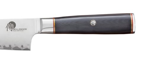 Na výrobu rukoväte noža Dellinger sa používa veľmi kvalitný materiál G-10 . Udrží si svoju tvrdosť a pevnosť. Rukoväť zdobí stredový mozaikový nit so znakom samuraja . Ten zároveň zaisťuje jej pevné spojenie s ostrím. Rukoväť je vyvážená a ergonomicky tvarovaná, takže sa vám nôž pohodlne drží v ruke.