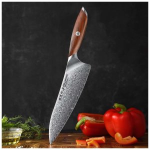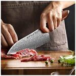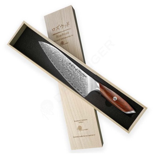 Rukoväť zo vzácneho dreva Rose-Wood zaručuje stabilitu a pohodlie pri krájaní. Jej ergonomický tvar skvele padne do ruky pravákom aj ľavákom. Ozdobný nit podčiarkuje precízne ručné spracovanie . Spojenie luxusného dreva a damascénskej čepele robí z noža skutočný klenot kuchyne.