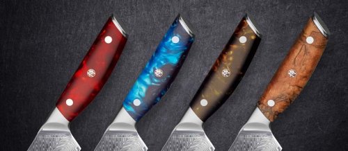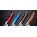 Pokiaľ máte radi originalitu, u tohto noža je zaručená. Dizajn rukoväte je naozaj jedinečný pri každom kuse. Rukoväť sa vyrába z prekrásnej epoxidovej živice . Jedná sa o priehľadnú živicu prefarbenú alkoholovými pigmentmi. Živica je vodeodolná a úplne bez zápachu. Časom sa môže stať, že sa začne meniť farba. O pevné spojenie damaškovej ocele a rukoväte sa postará aj trojité nitovanie . Tvar rukoväte je vhodný pre ázijský úchop noža.