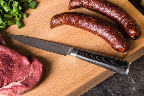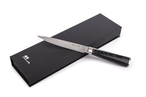 Rukoväť je vyrobená z extra pevného a odolného laminátového materiálu, nazývaného Micarta . Micartu tvorí plátno alebo sklená tkanina s termostatickou živicou. Výsledkom je pevná, húževnatá rukoväť , ktorá nepodlieha skaze času. Hladké, rovné, čisté línie tohto noža sa stanú ozdobou každej kuchyne.