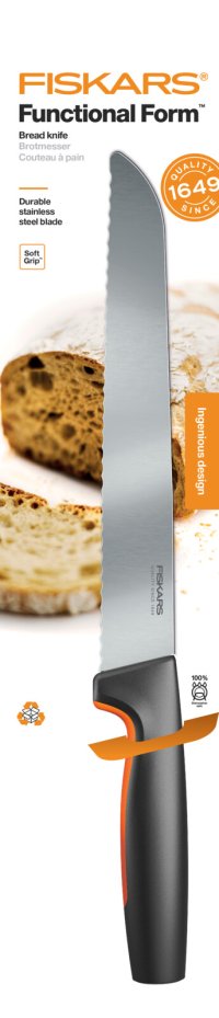• Nôž na pečivo Fiskars Functional Form™ má dlhú čepeľ so zúbkami a je navrhnutý pre pohodlné používanie s jednoduchou údržbou