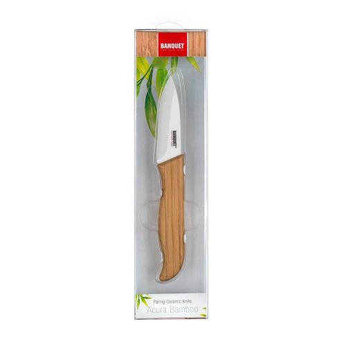 Nôž praktický keramický ACURA BAMBOO, bambusová rukoväť. Ostrie keramického noža je vyrobené z keramického materiálu zvaného oxid zirkóničitý. Táto zlúčenina vyniká vysokou pevnosťou a odolnosťou. Ergonomická rukoväť z TPR s protišmykovou úpravou. Nôž je veľmi odolný proti škvrnám a ľahko sa čistí. Čepeľ do seba neprepustí žiadnu z kyselín obsiahnutých v potravinách. Vitamíny sa vďaka keramickej čepeli z potravín nestrácajú. Mäso, zelenina či ovocie sa nelepí na nôž. Nôž má nízku hmotnosť a vyvážené ťažisko, ľahko sa s ním manipuluje pri práci. Keramické nože sú tvrdšie ako kovové, preto nepotrebujú každodenné prebrusovanie ocieľkou ako oceľové. Daňou za vysokú tvrdosť je ich krehkosť, preto sa neodporúča kosiť s nimi napr. kosti, lámať nôž pri krájaní a vyvarovať sa pádu noža na zem.