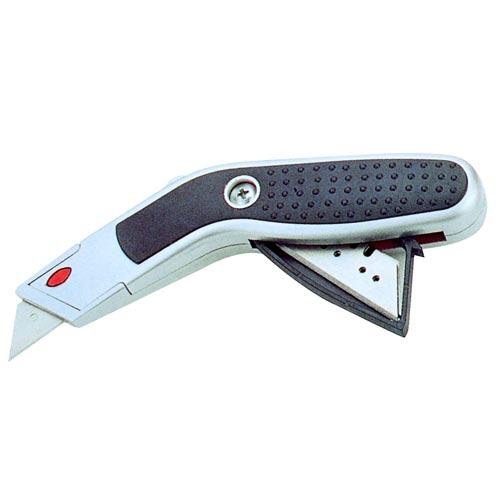Kovový nôž s výsuvnou lichobežníkovou čepeľou - ergonomický tvar s pogumovanou rukoväťou - výklopný zásobník na náhradné čepele Čepeľ je uchytená vo vnútri tela noža na posuvnom jazdci.