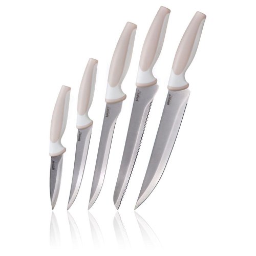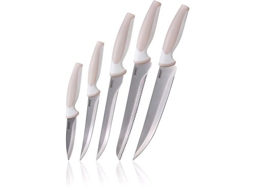 5 dielna sada TRINITY obsahuje praktický nôž 18,5 a 23,5 cm, porcovací nôž 32 cm, vykosťovací nôž 30 cm a nôž na chlieb 32 cm. Oceľové nože patria medzi nenahraditeľných pomocníkov v každej kuchyni. Výber vhodného noža nám uľahčí krájanie či porciovanie potravín.