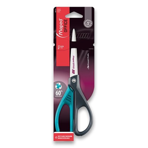 Nožnice Maped Essentials Metal Colours veľkosti 21 cm majú rukoväť z 60% post-industriálneho recyklovaného plastu.