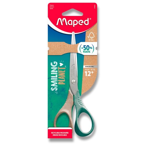 Nožnice Maped Smiling Planet Shape veľkosti 16 cm majú čepele vyrobené z brúsenej nerezovej ocele.