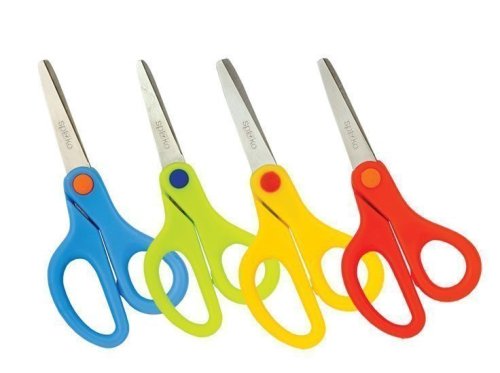 Školské nožnice veľ. 13 cm so zaguľatenou špičkou a meradlom na čepeli. Dĺžka nerezovej čepele 8 cm. Asymetrické rukoväte sú kryté mäkčeným plastom v rôznofarebnom prevedení. Balenie: 1 ks/blister.