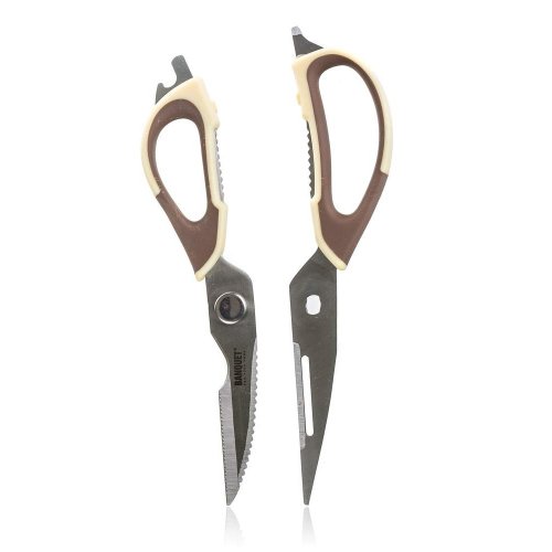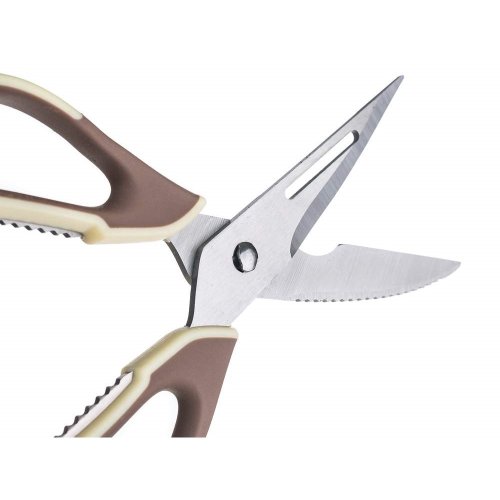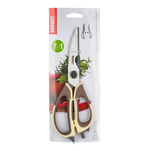 Kuchynské univerzálne rozložiteľné nožnice CULINARIA umožňujú okrem strihania aj lúskať orechy, škrabať ryby, otvárať fľaše, rezať kartóny, škrabať ovocie a zeleninu alebo napríklad strihať hydinu. Rukoväte sú v béžovo - hnedej farbe.