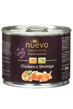 Konzerva Nuevo mačka adult Kurča a krevety je skvelý spôsob, ako dodať Vašej mačičke všetky potrebné výživné látky. Strava je založená na výberových zdrojoch bielkovín, predstavovaných kuracím mäsom a vynikajúcimi krevetami. Túto kombináciu čerstvých prísad si zamilujú aj vyberavé mačky. Krevety sú prirodzene bohaté na mastné kyseliny omega-3 a omega-6, ktoré priaznivo podporujú rast a kvalitu srsti a pokožky.