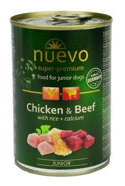 Mäsová konzerva pre šteňatá a mladých psov Nuevo Junior Kuracia a Hovädzia konzerva dodáva tie správne výživné látky podporujúce zdravý rast. Vysoký obsah čerstvého kuracieho a hovädzieho mäsa dodáva bielkoviny vysokej biologickej hodnoty. Vyvážená komplexná výživa so správnou úrovňou bielkovín, tukov, minerálov a vitamínov. Jej zloženie podporuje imunitu a pohyblivosť vášho psa. Žiadne umelé farbivá, žiadne príchute či konzervačné látky, a to od samotného začiatku!