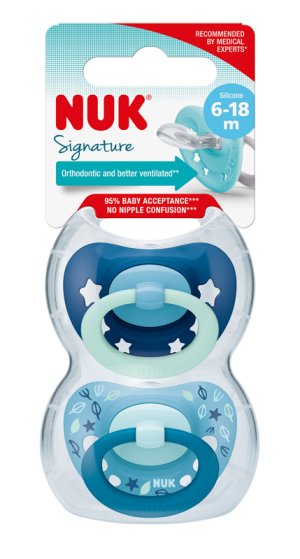 Silikónový cumlík Signature značky NUK je určený pre deti od narodenia do 6 mesiacov. Špeciálny tvar s ortodontickým cumlíkom Classic prispievajú k správnemu vývoju čeľuste. Cumlíky NUK radu Signature reagujú na potrebu prirodzenosti svojim úplne prirodzeným tvarom.