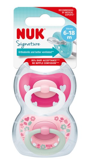 Silikónový cumlík Signature značky NUK je určený pre deti od narodenia do 6 mesiacov. Špeciálny tvar s ortodontickým cumlíkom Classic prispievajú k správnemu vývoju čeľuste. Cumlíky NUK radu Signature reagujú na potrebu prirodzenosti svojim úplne prirodzeným tvarom.