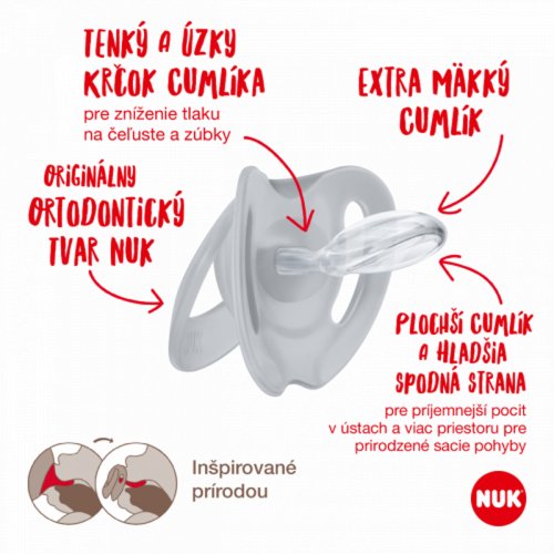 Vhodný pre správny vývoj čeľuste, a zvlášť šetrný pri dojčení - ľahké striedanie dojčenia a tíšenia cumlíkom, Extra mäkký - jemne sa pritisne k poschodiu vďaka špeciálnej mäkkej zóne na hornej strane cumlíka.