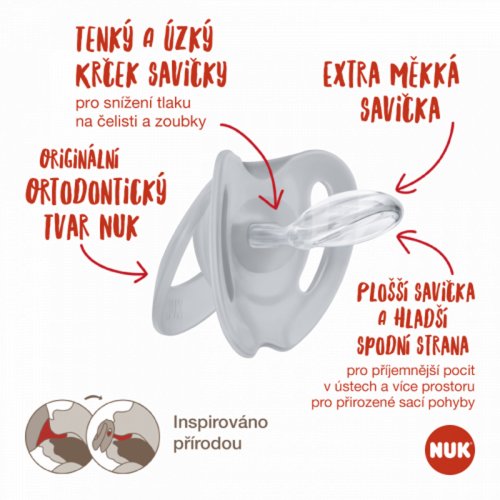 Vhodný pre správny vývoj čeľuste, a zvlášť šetrný pri dojčení - ľahké striedanie dojčenia a tíšenia cumlíkom, Extra mäkký - jemne sa pritisne k poschodiu vďaka špeciálnej mäkkej zóne na hornej strane cumlíka.