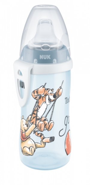 Detská fľaša NUK Activ Cup s atraktívnym motívom obľúbeného medvedíka Pú. Fľaša veľmi ľahká, odolná a nerozbitná, opatrená silikónovým nekvapkajúcim náustkom, ktoré zabraňuje vyliatiu nápoja. Má praktické viečko, aby zostal náustok čistý. S klipom na upevnenie za opasok pre väčšie deti. Široké hrdlo fľaše umožňuje jej ľahké čistenie. Hlavné vlastnosti: extra ľahká vyrobená z pevného a nerozbitného polypropylénu vhodná pre deti od 6 mesiacov s klipom na upevnenie za opasok klinicky testované bez obsahu BPA.