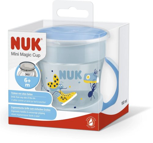 Hrnček je navyše mimoriadne malý a ľahko sa drží. Vďaka ergonomicky tvarovaným držiatkam ho ľahko môžu držať aj malé prstíky a rúčky. Aby ste hrnček NUK Mini Magic Cup udržali čistý av bezpečí, nech už ste kdekoľvek, súčasťou je ochranné viečko.