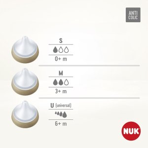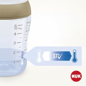 - 3× dojčenská fľaša NUK Perfect Match s patentovaným indikátorom kontroly teploty, jedna fľaša s objemom 150 ml vo veľkosti S (od 0 mesiacov pre materské mlieko), dve fľaše s objemom 260 ml vo veľkosti M (od 3 mesiacov pre umelé dojčenské mlieko), možno kombinovať so všetkými