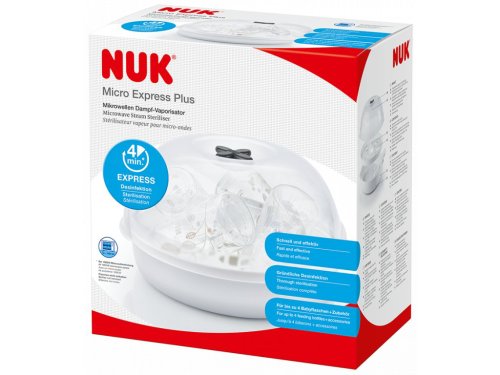 Sterilizátor NUK Micro Express Plus efektívne sterilizuje až 4 dojčenské fľaše a doplnky iba počas 4 minút pri 1000 W.