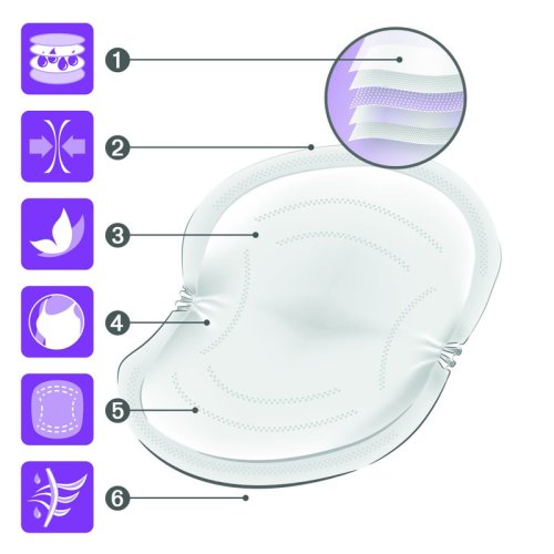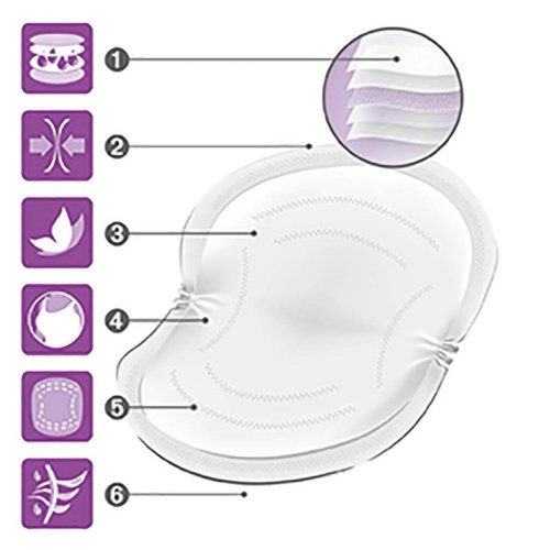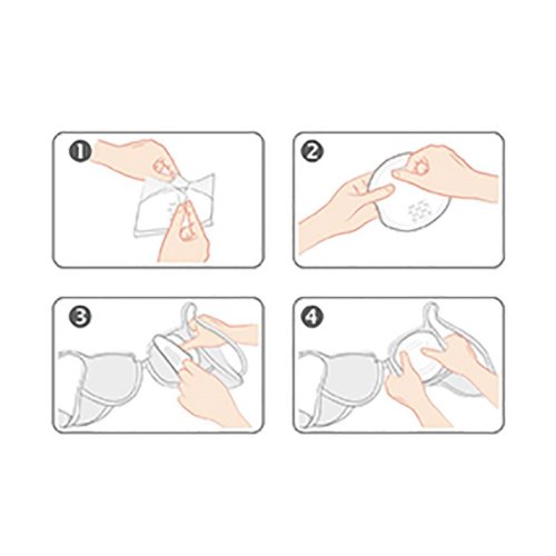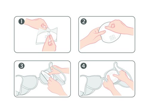 Bezpečnostné pokyny: Výrobok a obal uchovávajte mimo dosahu detí. Pred použitím prsný vankúšik odklopte az fixačného prúžku stiahnite ochrannú fóliu Prsné vankúšiky sú určené na jednorazové použitie a menia sa podľa potreby.