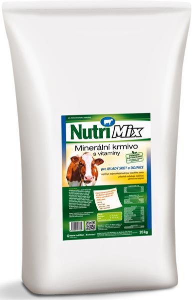 PROBLÉM Nedostatočná alebo nevyvážená kŕmna dávka pre mladý dobytok v odchove alebo vo výkrme má za následok znížené prírastky, nižšiu využiteľnosť krmiva, menšiu životaschopnosť a horší zdravotný stav. U dojníc môže znížiť produkciu mlieka. RIEŠENIE Nutrimix pre mladý dobytok a dojnice je určený na doplnenie minerálnych látok a potrebných vitamínov do kŕmnych dávok pre mladý dobytok od 6 mesiacov veku a pre dojnice chované v malochovoch. Priaznivo ovplyvňuje mliečnu úžitkovosť dojníc a zaisťuje úspešný odchov mladého hovädzieho dobytka. Prispieva k udržaniu dobrého zdravotného stavu zvierat. ZLOŽENIE v 1 kg: vápnik 100 g, fosfor 55 g, sodík 75 g, horčík 25 g, vitamín A 800 000 IU, vitamín D3 97 000 IU , vitamín E 500 mg, železo 930 mg, zinok 5 toho organická väzba 1 000 mg), mangán 1 960 mg (z toho organická väzba 400 mg), meď 710 mg (z toho organická väzba 140 mg), jód 105 mg, kobalt 40 mg, selén 6 mg (z toho organická väzba 1 ,2 mg), prírodný antioxidant 250 mg. SPÔSOB APLIKÁCIE Odmerané množstvo prípravku sa zamieša dohromady s jadrom alebo sa rovnomerne nasype do žľabu na krmu. Je nutné zaistiť trvalý prístup k zdravotne nezávadnej vode. DÁVKOVANIE Mladý dobytok: 50 - 150 g / 1 ks / deň Dojnice: 100 - 200 g / 1 ks / deň ODPORÚČANÁ KRMNÁ DÁVKA PRE DOJNICU O HMOTNOSTI 650 KG A PRODUKCIU 16 l MLIEKA/DEŇ: šrot 3 – 4 kg, 200 g Nutrimixu pre dojnice.