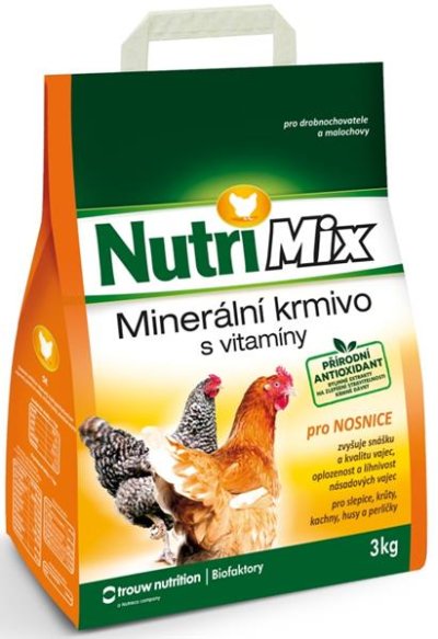 PROBLÉM Nedostatočná alebo nevyvážená kŕmna dávka pre nosnice má za následok zníženú znášku, zhoršenú kvalitu vajec, oplodnenosť a liahnivosť násadových vajec. RIEŠENIE Nutrimix pre NOSNICE je určený na doplnenie minerálnych látok a vitamínov do kŕmnych dávok pre sliepky, kačice, husi, morky alebo perličky chované v drobnochovoch. Podporuje zvýšenie znášky, oplodnenosť a liahnivosť násadových vajec. Zaisťuje dobrý zdravotný stav hydiny a zlepšuje využitie prijatých krmív. Pridáva sa do kŕmnej dávky, ktorá je založená na obilných šrotoch alebo iných neplnohodnotných krmivách, popr. kuchynských zvyškoch atď. ZLOŽENIE v 1 kg: vápnik 280 g, fosfor 40 g, sodík 9 g, lyzín 1,3 g , metionín 10 g, treonín 1 g, vitamín A 180 000 IU, vitamín D3 30 000 IU . E 150 mg, vitamín K3 15 mg, vitamín B1 20 mg, vitamín B2 50 mg, niacínamid 150 mg, pantoténán vápenatý 80 mg, vitamín B6 20 mg, vitamín B12 0,1 mg, betaín 3 000 mg, železo 500 mg, zinok 460 mg, mangán 890 mg, jód 3,2 mg, selén 1,4 mg, prírodný antioxidant 60 mg, bylinné extrakty na zlepšenie stráviteľnosti kŕmnej dávky 1 900 mg. SPÔSOB APLIKÁCIE Odmerané množstvo prípravku sa podáva denne rovnomerne zamiešané do krmiva. Je nutné zaistiť trvalý prístup k zdravotne nezávadnej vode. DÁVKOVANIE Sliepky, kačice, husi, morky, perličky v období znášky 100 g / 10 ks / deň v období znáškového pokoja 60 g / 10 ks / deň (1 plná polievková lyžica - cca 33 g) ODPORÚČANÁ KRMNÁ DÁVKA : 200 g pšeničného šrotu, 50 g hrubo šrotovanej kukurice, 800 g parených zemiakov, 100 g Nutrimixu pre nosnice.