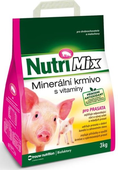 PROBLÉM Nedostatočná alebo nevyvážená kŕmna dávka pre ošípané v odchove alebo vo výkrme má za následok znížené prírastky, nižšiu využiteľnosť krmiva, menšiu životaschopnosť a horší zdravotný stav. RIEŠENIE Nutrimix pre ošípané je určený na doplnenie minerálnych látok a vitamínov do kŕmnych dávok pre odstavené prasiatka a vykrmované ošípané v drobnochovoch. Podporuje dosiahnutie vysokých prírastkov, využitie prijatých živín a zaisťuje zodpovedajúci zdravotný stav. Pridáva sa do kŕmnej dávky, ktorá je založená na obilných šrotoch alebo iných neplnohodnotných krmivách, popr. kuchynských zvyškoch atď. ZLOŽENIE v 1 kg: vápnik 180 g, fosfor 33 g, sodík 20 g, lyzín 42 g, metionín 1 g, threonin10 g, vitamín A 85 000 IU , vitamín D3 15 000 IU , mg , vitamín B2 40 mg, vitamín B12 0,2 mg, betaín 900 mg, železo 500 mg, zinok 1 310 mg, meď 230 mg, mangán 450 mg, jód 10 mg, selén 2,8 mg, prírodný antioxidant 100 mg, bylinné extrakty na zlepšenie príjmu krmiva a redukciu tvorby amoniaku 2 700 mg. SPÔSOB APLIKÁCIE Odmerané množstvo prípravku sa podáva denne rovnomerne zamiešané do krmiva. Je nutné zaistiť trvalý prístup k zdravotne nezávadnej vode. DÁVKOVANIE Prasiatka 8 - 20 kg živej hmotnosti: 30 - 60 g / 1 ks / deň Ošípané 20 - 100 kg živej hmotnosti: 60 - 120 g / 1 ks / deň Ošípané nad 100 kg živej hmotnosti: 120 g / 1 ks / deň ( 1 plná polievková lyžica - cca 33 g) ODPORÚČANÁ KRMNÁ DÁVKA PRE 100 KG VÁŽIACE PRASE: miešačka - 350 g pšeničného šrotu, 350 g jačmenného šrotu, 2 kg parených zemiakov, 100 g Nutrimixu.