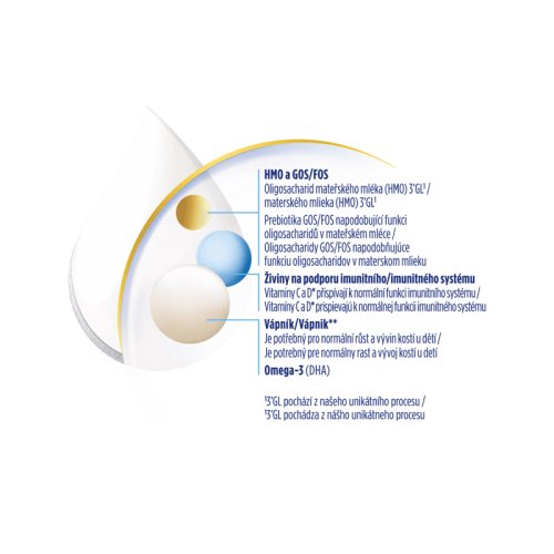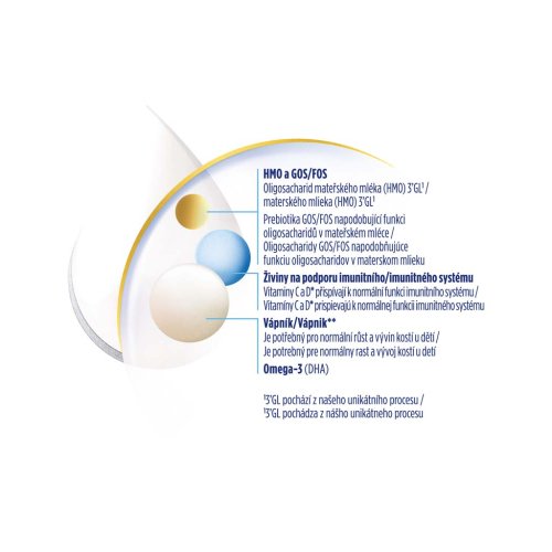 Naše jedinečné zloženie obsahuje našu patentovanú zmes PREBIOTIK GOS/FOS a LCP, oligosacharid materského mlieka 3´GL (3´galaktosyllaktóza), ktorý prináša náš unikátny proces výroby, vitamíny C a D, ktoré prispievajú k podpore imunity a tiež vápnik potrebný pre normálny rast a vývin kostí u detí. Naša inovovaná receptúra je BEZ PALMOVÉHO OLEJA.