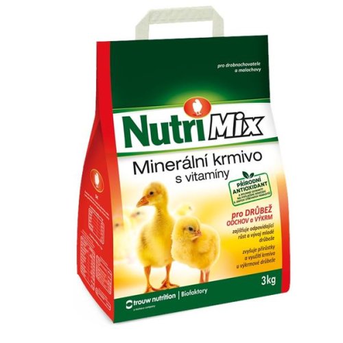 PROBLÉM Nedostatočná alebo nevyvážená kŕmna dávka pre hydinu v odchove alebo vo výkrme má za následok znížené prírastky, nižšiu využiteľnosť krmiva, menšiu životaschopnosť a horší zdravotný stav. RIEŠENIE Nutrimix pre hydinu - odchov a výkrm je určený na doplnenie minerálnych látok a vitamínov do kŕmnych dávok pre kurčatá, kačica, husáta, morčatá a ďalšiu hydinu chovanú v drobnochovoch. Podporuje dosiahnutie maximálnych prírastkov, využiteľnosť krmív, životaschopnosť a dobrý zdravotný stav rastúcej hydiny. Pridáva sa do kŕmnej dávky, ktorá je založená na obilných šrotoch alebo iných neplnohodnotných krmivách, popr. kuchynských zvyškoch atď. ZLOŽENIE v 1 kg: vápnik 200 g, fosfor 48 g, sodík 15 g, lyzín 14 g , metionín 20 g, treonín 2 g, vitamín A 250 000 IU , vitamín D3 40 000 IU. mg, vitamín K3 30 mg, vitamín B1 30 mg, vitamín B2 60 mg, niacínamid 210 mg, pantoténán vápenatý 100 mg, vitamín B6 25 mg, vitamín B12 0,2 mg, betaín 3 100 mg, železo 880 mg, zinok 740 , mangán 1 240 mg, jód 5 mg, selén 2,2 mg, prírodný antioxidant 160 mg, bylinné extrakty na potlačenie kokcídií a iných črevných parazitov 2 000 mg. SPÔSOB APLIKÁCIE Odmerané množstvo prípravku sa podáva denne rovnomerne zamiešané do krmiva. Je nutné zaistiť trvalý prístup k zdravotne nezávadnej vode. DÁVKOVANIE Kurčatá, kačica a hustá do 8 týždňov veku: 30 - 60 g / 10 ks / deň nad 8 týždňov veku: 60 g / 10 ks / deň Morčatá a perličky do 8 týždňov nad 3:30 - 75 g 8 týždňov staroby: 90 g / 10 ks / deň (1 plná polievková lyžica - cca 30 g) ODPORÚČANÁ KRMNÁ DÁVKA PRE 10 VYKRMOVANÝCH kurčiat: miešačka - 300 g pšeničného šrotu, 700 g parech brúch 50 cm parných brám