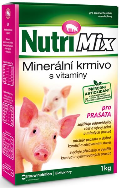 PROBLÉM Nedostatočná alebo nevyvážená kŕmna dávka pre ošípané v odchove alebo vo výkrme má za následok znížené prírastky, nižšiu využiteľnosť krmiva, menšiu životaschopnosť a horší zdravotný stav. RIEŠENIE Nutrimix pre ošípané je určený na doplnenie minerálnych látok a vitamínov do kŕmnych dávok pre odstavené prasiatka a vykrmované ošípané v drobnochovoch. Podporuje dosiahnutie vysokých prírastkov, využitie prijatých živín a zaisťuje zodpovedajúci zdravotný stav. Pridáva sa do kŕmnej dávky, ktorá je založená na obilných šrotoch alebo iných neplnohodnotných krmivách, popr. kuchynských zvyškoch atď. ZLOŽENIE v 1 kg: vápnik 180 g, fosfor 33 g, sodík 20 g, lyzín 42 g, metionín 1 g, threonin10 g, vitamín A 85 000 IU , vitamín D3 15 000 IU , mg , vitamín B2 40 mg, vitamín B12 0,2 mg, betaín 900 mg, železo 500 mg, zinok 1 310 mg, meď 230 mg, mangán 450 mg, jód 10 mg, selén 2,8 mg, prírodný antioxidant 100 mg, bylinné extrakty na zlepšenie príjmu krmiva a redukciu tvorby amoniaku 2 700 mg. SPÔSOB APLIKÁCIE Odmerané množstvo prípravku sa podáva denne rovnomerne zamiešané do krmiva. Je nutné zaistiť trvalý prístup k zdravotne nezávadnej vode. DÁVKOVANIE Prasiatka 8 - 20 kg živej hmotnosti: 30 - 60 g / 1 ks / deň Ošípané 20 - 100 kg živej hmotnosti: 60 - 120 g / 1 ks / deň Ošípané nad 100 kg živej hmotnosti: 120 g / 1 ks / deň ( 1 plná polievková lyžica - cca 33 g) ODPORÚČANÁ KRMNÁ DÁVKA PRE 100 KG VÁŽIACE PRASE: miešačka - 350 g pšeničného šrotu, 350 g jačmenného šrotu, 2 kg parených zemiakov, 100 g Nutrimixu.