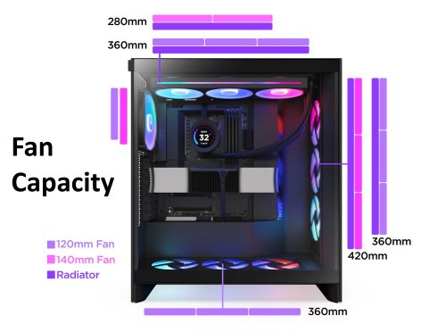 Počítačová skriňa NZXT H7 Flow RGB je pripravená na uloženie PC komponentov a tiež následné efektívne chladenie. Disponuje trojicou predinštalovaných 140mm ventilátorov s RGB podsvietením a jedným ventilátorom F120Q na chladenie s tichým chodom. Perforovaný predný a horný panel ešte zvyšuje prúdenie vzduchu a celkový chladiaci výkon. Vnútorný priestor skrine umožňuje efektívnu správu káblov a ich vedenie pomocou háčikov alebo popruhov. Prístup ku komponentom v prípade výmeny je ľahký a bez nutnosti použiť náradie. Samozrejmosťou je aj prítomnosť základných portov umiestnených na hornom paneli.