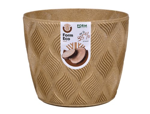 Plastový obal na črepník v elegantnom dizajne s 3D efektom a dekorom prameňov. Kruhového pôdorysu. Obal je vyrobený z recyklovaného plastu s obsahom až 35% drevených štiepok. Vhodné do interiéru. Rozmery: priemer 15, výška 12cm. Farba: svetlo hnedá.